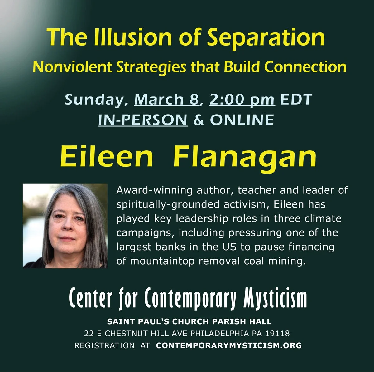 In her newest book, Common Ground: How the Crisis of the Earth is Saving Us from Our Illusion of Separation, Eileen shows us that “the illusion of separation”—the fallacy that humans can thrive in a dying world—is at the root of environmental crises. And, it’s often politicians and corporations who benefit by keeping the rest of us divided across lines of race, class, religion, and generation. Don't miss this opportunity to engage with this key leader in today's spiritually-grounded activism movement. Click below to join us either IN-PERSON or via LIVESTREAM…